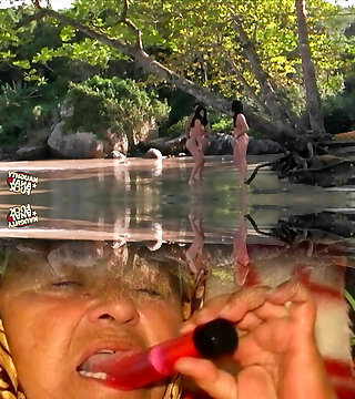Two gorgeous women play in the water before deep-throating and fucking a massive fat dick