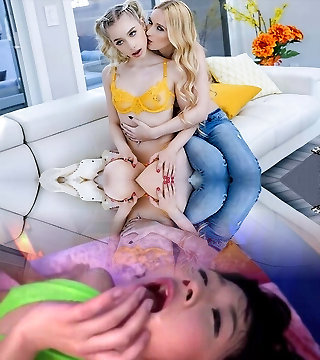 Teen girl/girl babes kissing on a sofa then spreading legs in tend