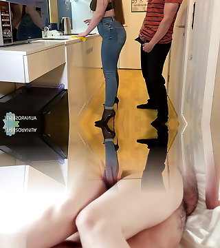 Stepmom pulled down her jeans so I can jerk off and cum on her tights caboose