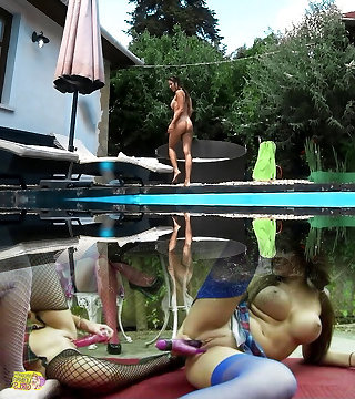 Two super-steamy lezzies have sex while getting suntan by the pool