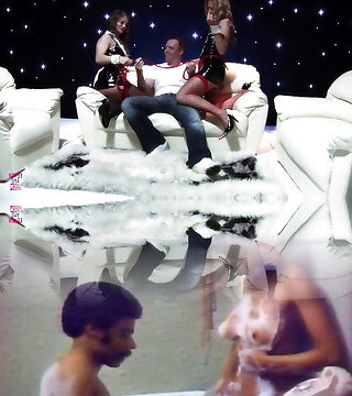 Two Girls in Spandex and Leather Costumes Fellate and Bang a Lucky Bald Guy