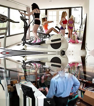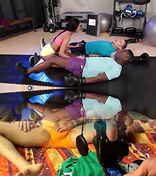 Naked man fucks a few clad dolls in a gym after they practise yoga